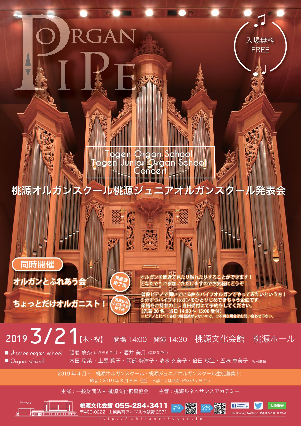 | 桃源オルガンスクール発表会 2019年3月21日(木・祝) 開場:14時 開演:14時30分 会場:桃源文化会館 入場:無料 画像クリックで拡大画像 |