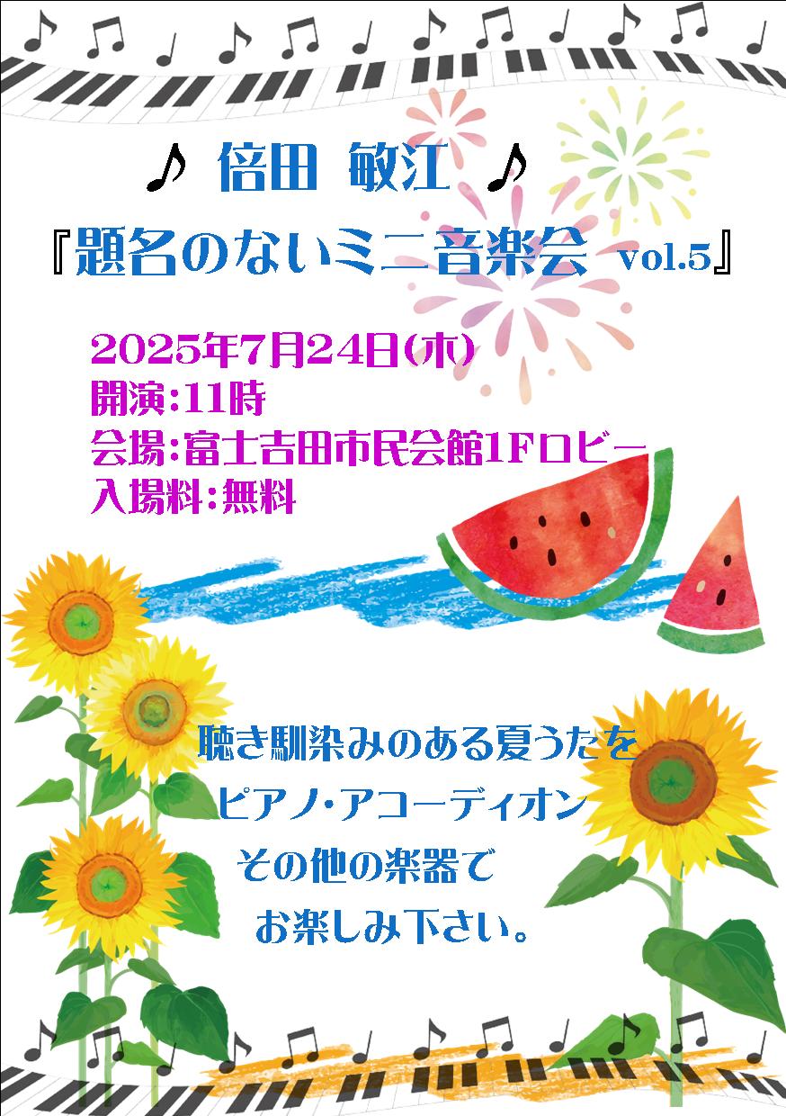 ロビーコンサート ♪倍田 敏江♪ 『題名のないミニ音楽会 vol.5』 2024年7月24日(木) 開演:11時 会場:富士吉田市民会館1Fロビー 入場料:無料 |