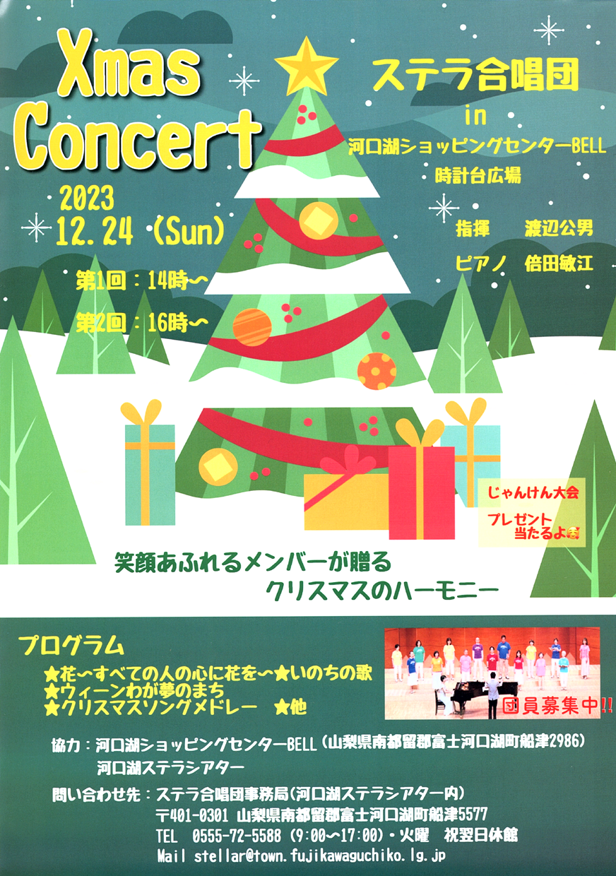 | ステラ合唱団 Xmas Concert 「クリスマス コンサート」 2023年12月24日(日) 第1回:14時~ 第2回:16時~ 会場:河口湖ショッピングセンターBELL 時計台広場 画像クリックで拡大画像(PDF) |