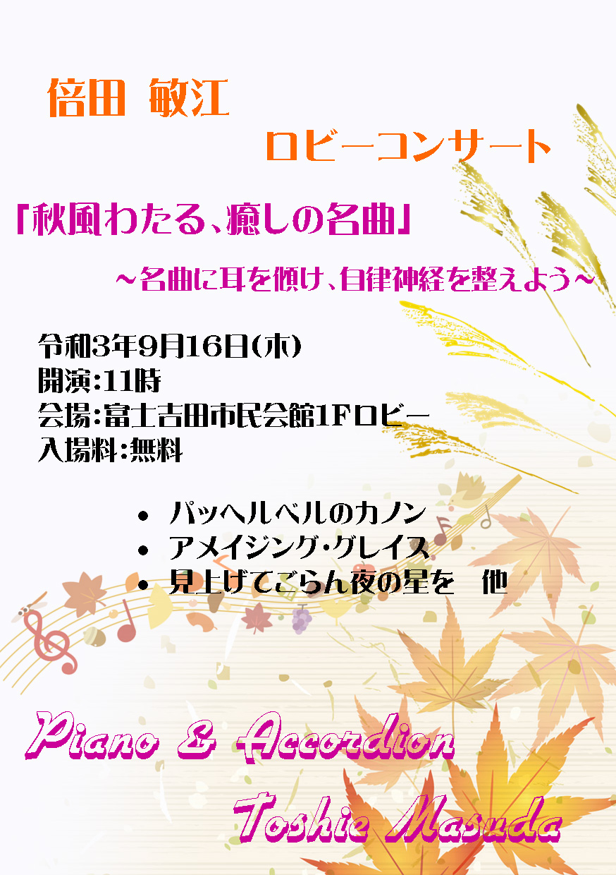 | ロビーコンサート 令和 元年9月26日(木) 開演:11時 会場:富士吉田市民会館1Fロビー 入場料:無料 |